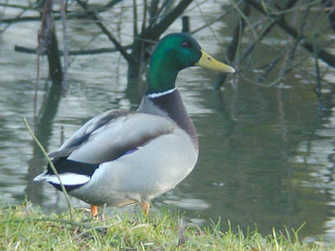 Le canard Colvert mâle a un long corps gris avec la poitrine brun-lilas, on voit un miroir irisé bordé de blanc sur les ailes du mâle et de la femelle.