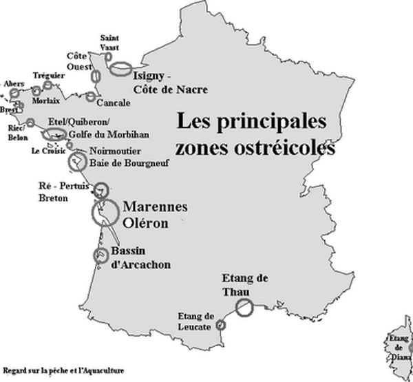 Carte des principales zones ostréicoles françaises.
