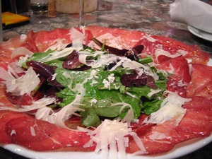 Elle est servie coupée en tranches très fines, agrémentées d’huile d’olive, de copeaux de parmesan et de roquette.