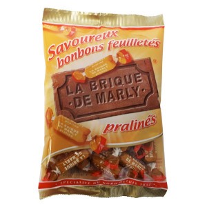 La Brique de Marly est un bonbon feuilleté et praliné aux noisettes. La recette comprend : sucre, sirop de glucose, praliné noisettes, caramel, arôme vanille naturel.