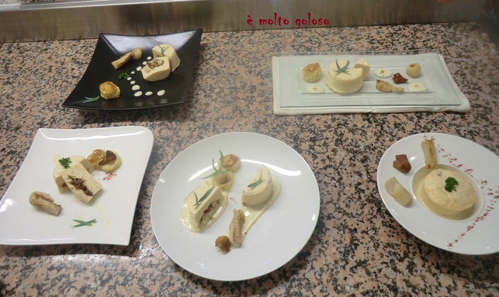 - ♦ Confectionner une farce mousseline : chairs de lotte, Saint Jacques et saumon mixées, assaisonner, ajouter 3 blancs d’œuf. Finir avec 1.100 kg de crème épaisse en montant sur glace. Réserver au frais.