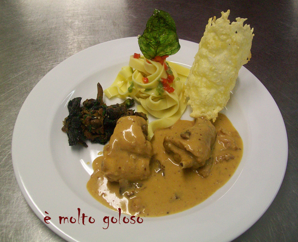 ♦ Dresser sur assiettes chaudes : 2 morceaux de lapin nappés de sauce moutarde, 1 bouquet de tagliatelle au pistou (pignon, basilic et huile d’olive), des champignons et 1 tuile parmesan.