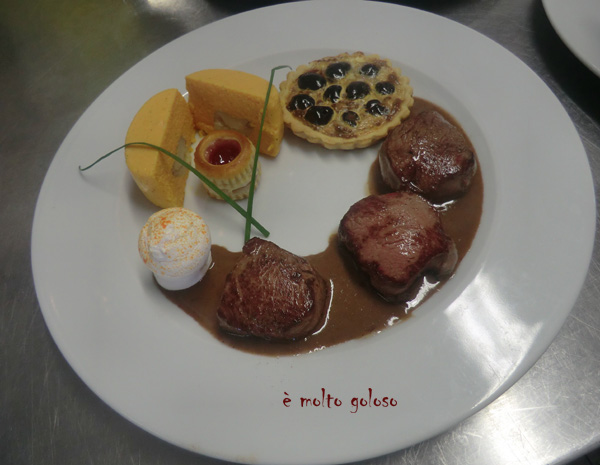 • Dresser sur assiettes chaudes : fond de sauce, 3 noisettes de chevreuil. Finir avec 1 tartelette, 1 flan coupé en 2, 1 bouchée de gelée de groseille. Poser 1 cèpes en macaron et 2 brins de ciboulette au départ.