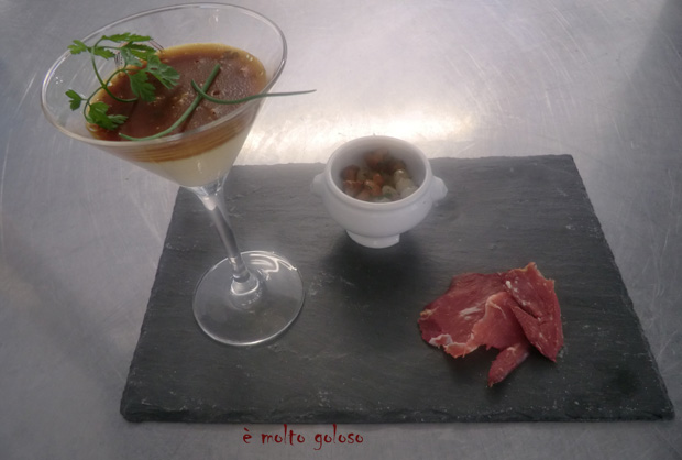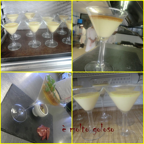 - ◊ Dresser sur ardoises chaudes : Verre de crème prise au foie gras, tête de lion de girolles/crosnes et magret fumé. Finir avec cerfeuil et ciboulette.