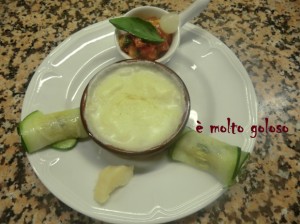 - ♦ Dresser les divers éléments sur assiettes : 1 gratin de gnocchi, 1 cassolette de tartare de tomate, 2 courgettes farcies anchois. Finir petit oignon, morceaux de parmesan et feuille de basilic.