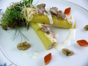 Spécialités : ravioles de pintade à la truffe d’Alba, patata all’uovo gratinata al parmigiano con tartufo d’Alba, gnocco di patata farcito di crostacci, zabaglione di pomodoro e basilico, riso carnaroli con zucca gialla, gorgonzola dolce aceto balsamico e amaretti.