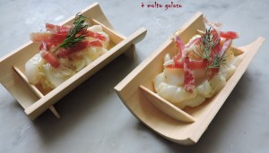 - ♦ Dresser les tartares en verrines bois. Finir avec la julienne de coppa italienne.