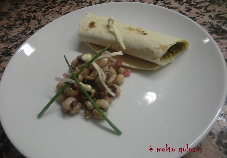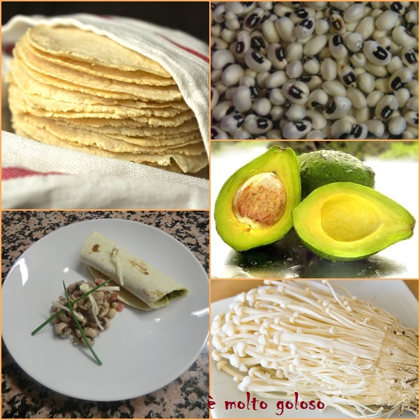 - ♦ Dresser sur assiettes à entremets froides : tortillas, salade de haricots. Finir avec des champignons enoki et brins de ciboulette.