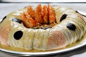 Couronne : Dresser un couronne : garnir le fond d’un plat avec une préparation en laissant un espace libre au milieu pour y placer une garniture (couronne ou turban de riz).
