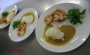 - ♦ Dresser sur assiette chaude : filet de Saint Pierre, cordon de sauce homard, rouelles d’oignons frits. Finir salade d’herbes.