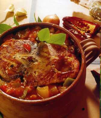 - * Faire suer (compoter) l’oignon, les piments dans de l’huile d’olive, ajouter l’ail, les tomates, du persil, du laurier et du piment d’Espelette AOc.