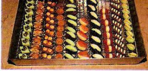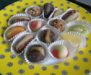 Candir : Immerger, dans une candissoire, des fruits fourrés de pâte d’amandes, de fondant, bonbons fondants, etc. dans un sirop de sucre à candir « froid », en vue de les enrober d’une couche de fins cristaux de sucre.