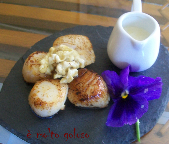 - ♦ Dresser sur ardoises chaudes : 4 noix et les noix, sauce en petits pots. Décorer avec une pensée ou une autre fleur comestible.