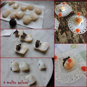 - ♦ Mixer 150 grammes de saumon fumé d’Écosse. Monter 500 grammes de crème fouettée, relever au piment de Cayenne (pas de sel). Mettre en poche douille cannelée. Réserver au frais.