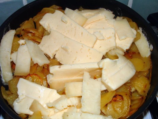 - ¤ Ajouter à ce moment là 300 grammes de Tome fraîche de l’Aubrac coupée en lamelles et 120 grammes de fromage de Laguiole en tranches fines.