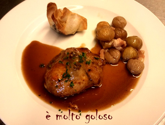 - ♦ Dresser sur grandes assiettes chaudes : un bonbon croustillant, une caille et des châtaignes au jus et lardons fumés. Fond de sauce.