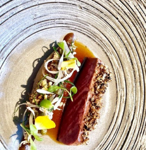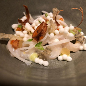 Plats : Eau de source, truite et peau, genévrier vert et poutargue – Cœur et bœuf maturé, moelle grillée, dashi et framboise – Peau de poulet, chanterelle et cerise – Naan allemand, pin et thé aux champignons.