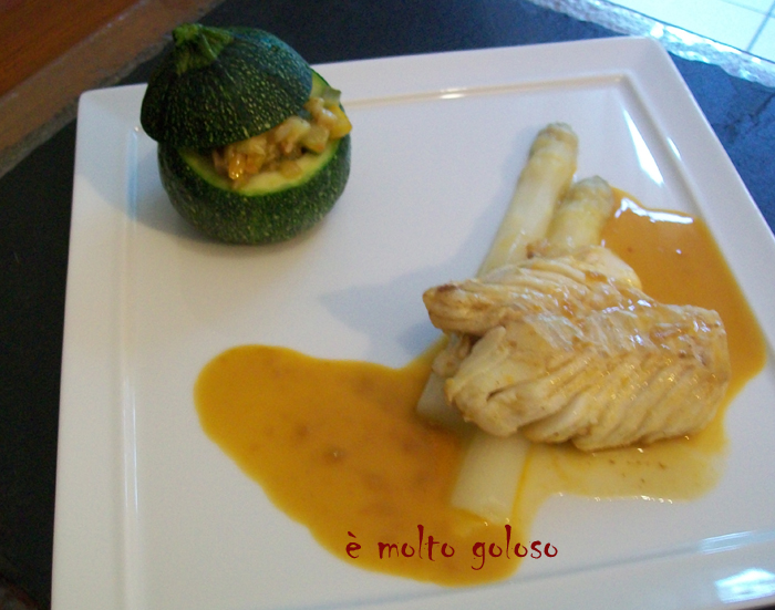 - ¤ Dresser sur assiettes carrées chaudes : courgette farcie lustrée à l’huile d’olive, 2 asperges, pavé de cabillaud. Finir avec jus de favouilles.