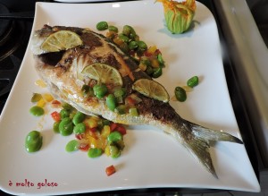 - ♦ Dresser sur assiettes chaudes : daurade grillée entourée de légumes. Finir avec une fleur de courgette.