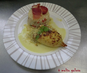 ♦ Dresser sur assiettes chaudes : calamar farci nappé + pluches de cerfeuil. Riz valencienne moulé. Finir avec jambon cru et tranche de chorizo.