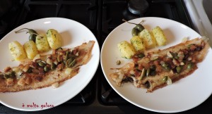 - ♦ Ajouter les caprons et citron en dés. Arroser avec le beurre. Finir de cuire les soles. Ajouter les petits croûtons.