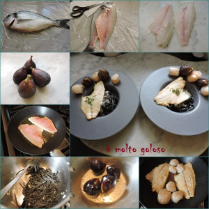 - ◊ Dresser en assiettes creuses chaudes : linguine, filet de daurade, cordon de sauce au Noilly. Finir avec les Saint Jacques, figues et alfalfa sur la daurade.