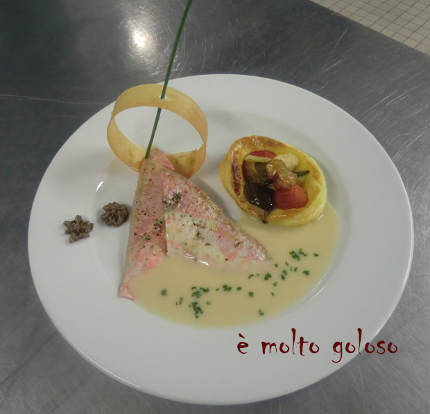 - • Cuire très rapidement les filets de rouget dans un four vapeur. Lustrer à l’huile d’olive fruitée. Lustrer également les 12 tartelettes de légumes.
