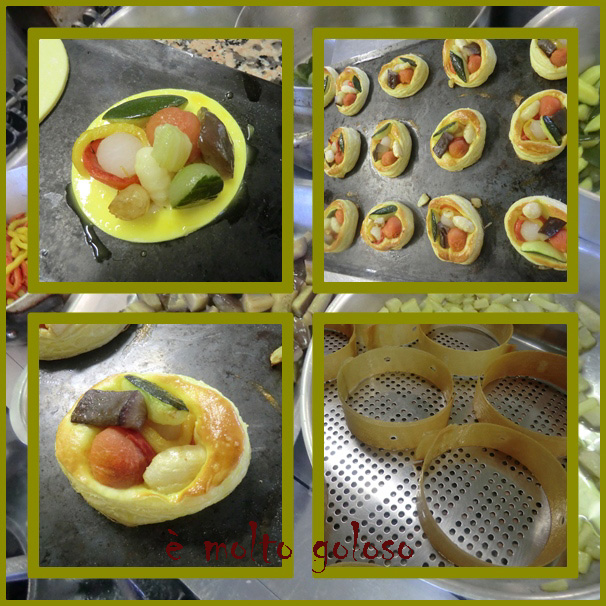 - • Monter 12 tartelettes de 8 cm de Ø en pâte feuilletée (voir photos). Cuire à four chaud + 220°C pendant 10 minutes environs.