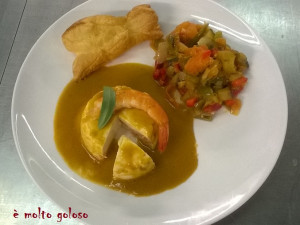 - ◊ Dresser sur assiettes chaudes : mousseline coupée plus 1 crevette, napper de sauce, feuille d’estragon. Finir avec ratatouille et fleuron au départ.