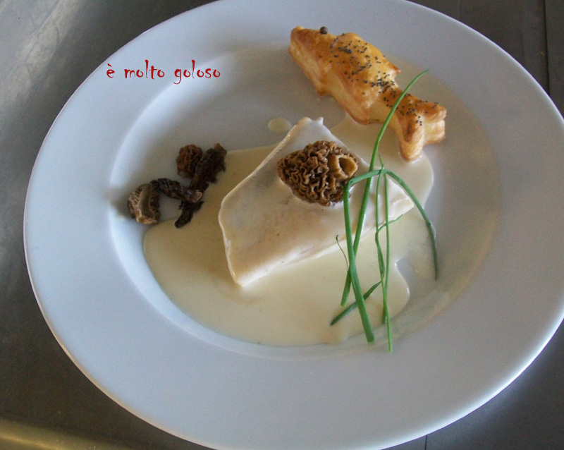 - ◊ Dresser sur assiette chaudes : pavé de sandre, bouquet de girolles, 2 quenelles, fleuron. Finir avec 1 brin de ciboulette et cordon de sauce au vin de paille.