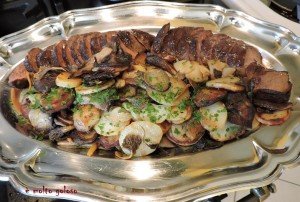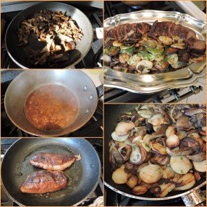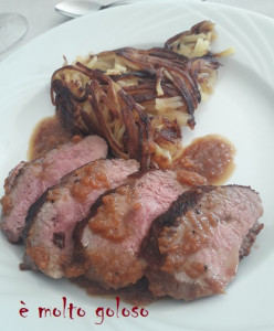 - ◊ Dresser sur plat chaud : magrets, et légumes. Persil haché sur légumes et sauce sur les magrets.