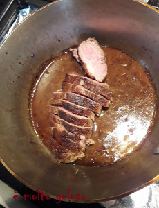 - ◊ Sauter les magrets (rosés) sans matière grasse. Laisser reposer 15 minutes.