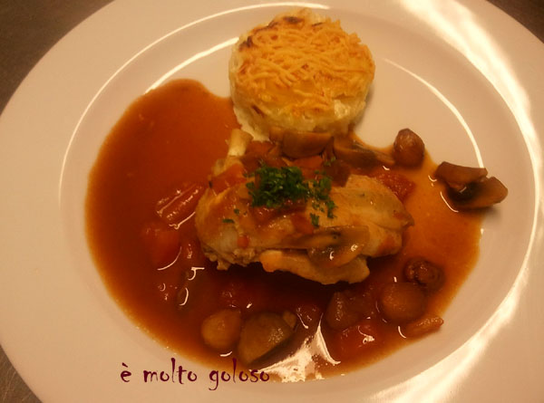 - * Ajouter la volaille à la sauce non passée et mijoter 5 minutes. Ajouter les champignons et petits oignons.
