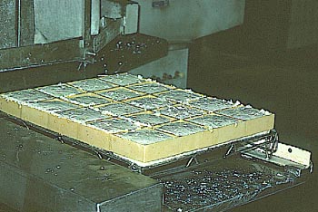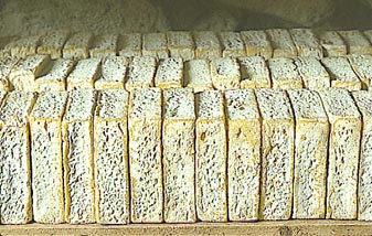 ¤ Le caillé est moulé dans des moules carrés.