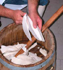 - Le Nuoc-mâm est élaboré à partir d’anchois et de gros sel. Les poissons sont disposés dans des tonneaux de bois par couches successives alternées avec des couches de sel. L’ensemble séjourne 3 mois dans le tonneau puis on extrait le liquide formé par une canule située en bas du tonneau.