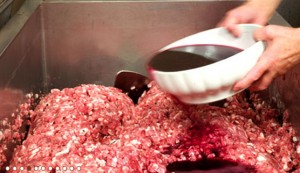 ♦ Malaxage – la chair est préparée en malaxant de façon homogène la viande, la graisse et le mélange de salaison, à base de sel marin, de grains de poivre et d’une infusion d’ail et de vin rouge filtrée. Le rapport graisse/viande maigre ne doit pas dépasser 30% du mélange ; il est interdit d’utiliser des adjuvants non prévus par le cahier des charges;