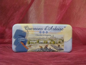 Il est composé de nougatine caramélisée aux amandes et aux noisettes, enrobée d’un chocolat bleu, imitant dans sa forme et sa couleur le morceau d’ardoise.