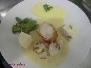 - ◊ Dresser sur assiettes chaudes : râble tranché avec cordon de sauce dijonnaise. Virgule de polenta crémeuse et bouquet de pois gourmands au jambon cru. Farce coupée sur l’assiette.