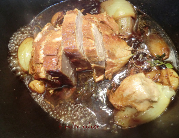 - ♦ Chauffer huile d’olive et beurre avec thym frais et gousses d’ail. Colorer la longe de porc sur toutes les faces. Cuire à couvert dans la cocotte.