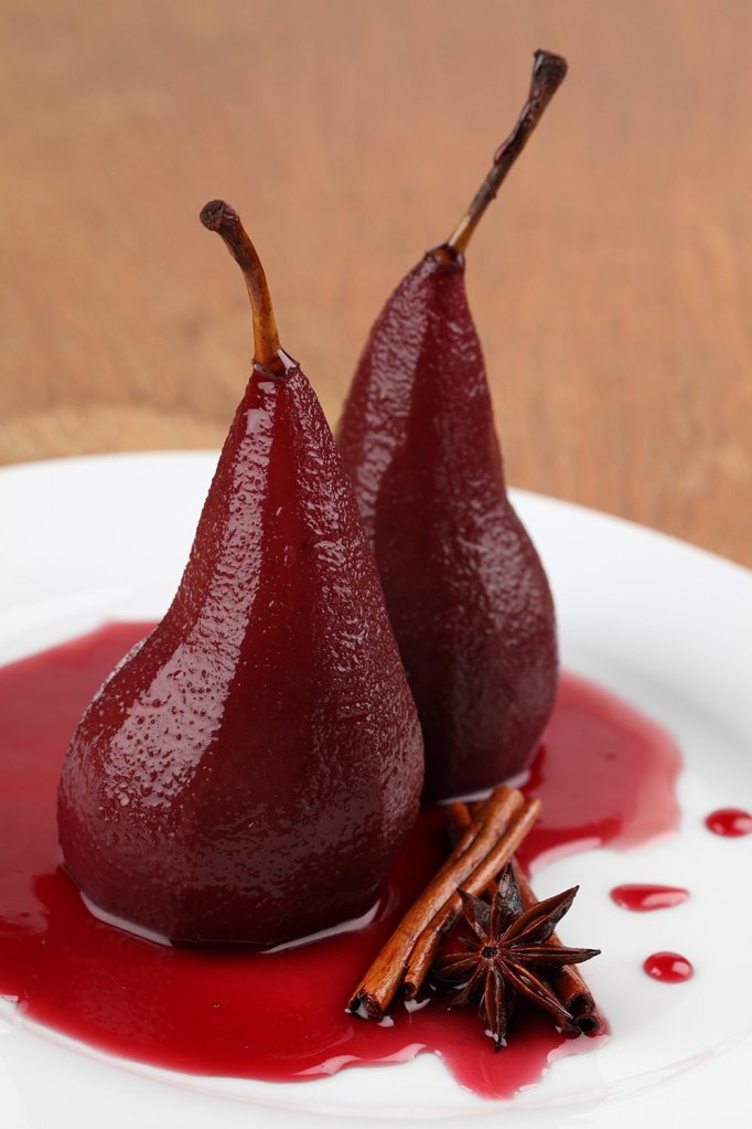 Pour accommoder les poires au vin rouge, sont utilisés un vin fruité, dans ce cas un beaujolais, du sucre ou du miel, des clous de girofle, des grains de poivre, un morceau de bâton de cannelle, une gousse de vanille et un zeste d’orange. Peuvent aussi être utilisés du gingembre et de la cardamome, et pour soutenir la couleur rouge un peu de liqueur de cassis ou de framboise.