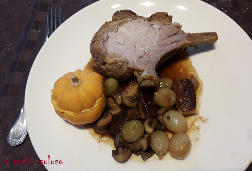 - Dresser sur assiettes chaudes : 1 tranche de carré, garniture et courge.