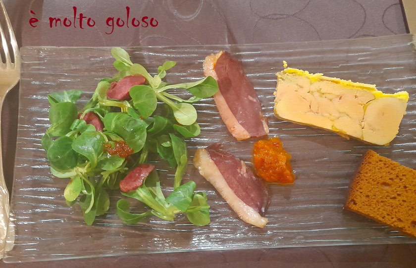 - Dresser sur assiettes rectangulaires froides : foie gras, pain d’épices, magret fumé, chutney et mâche aux gésiers confits.