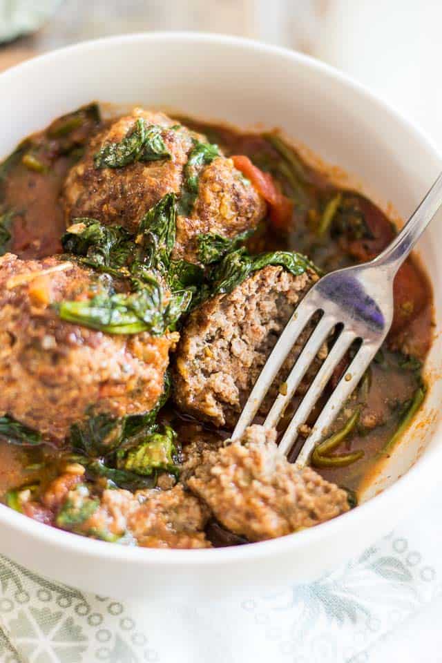 Les polpettina alla fiorentina sont cuisinées en sauce avec des épinards.
