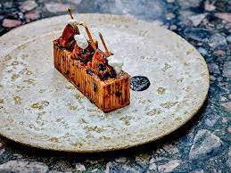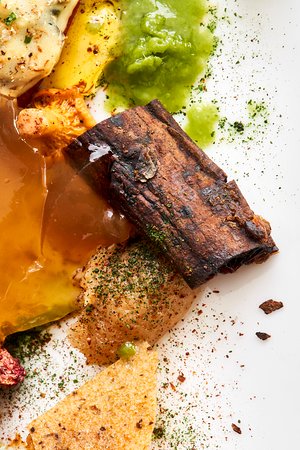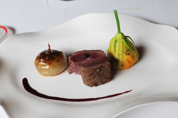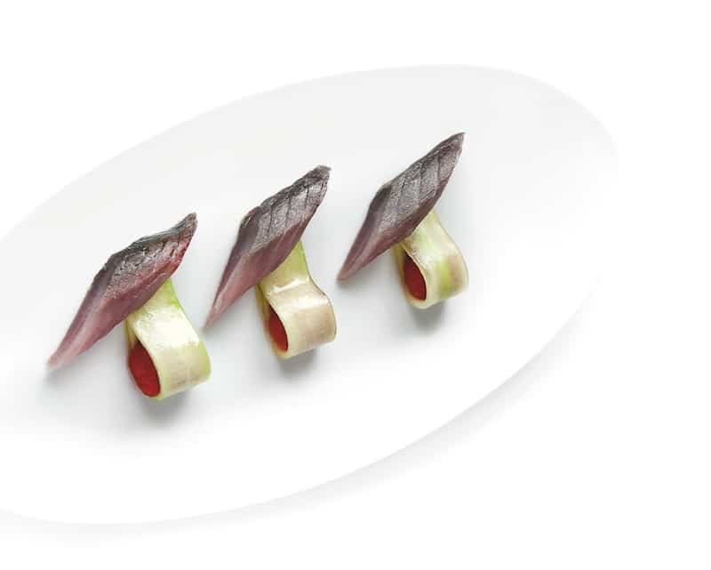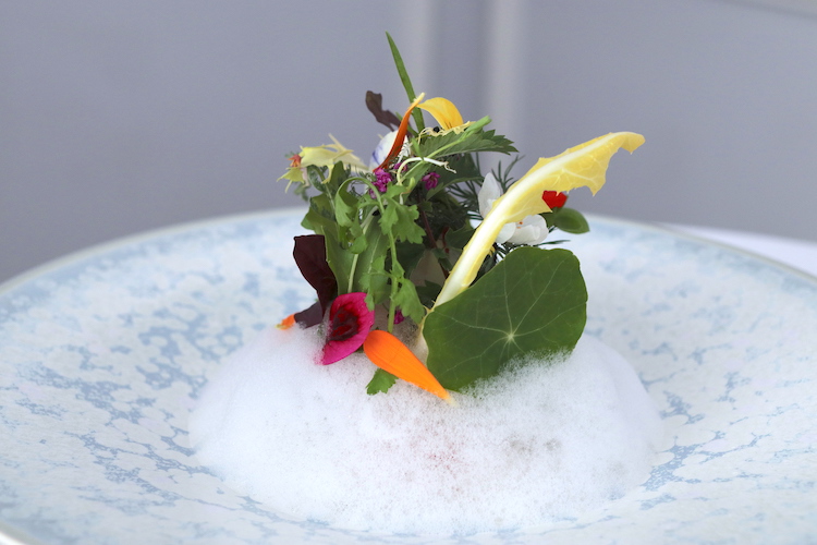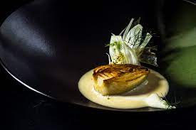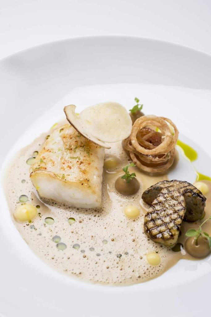 Turbot sélection Frantzèn, caviar, vin jaune et pignons grillés – Rhum raisin, ice-cream, foie gras et tnkav Bean Waffles – Oignons réglisse amande – Crudo de pétoncles avec navet salé de Tokyo, myoga et vinaigrette aux pétoncles fermentés – Crabe royal grillé sur les braises de bouleau avec sauce piquante – Daim rôti aux épices, orange sanguine, beurre de foie gras et jus de rôti avec un thé intense d’os de daim grillés et champignons fermentés aux algues rouge et tofu soyeux.