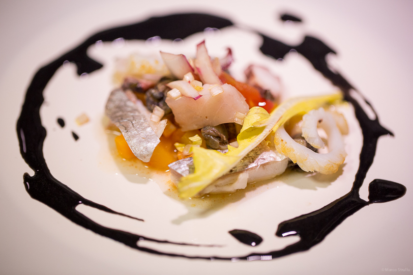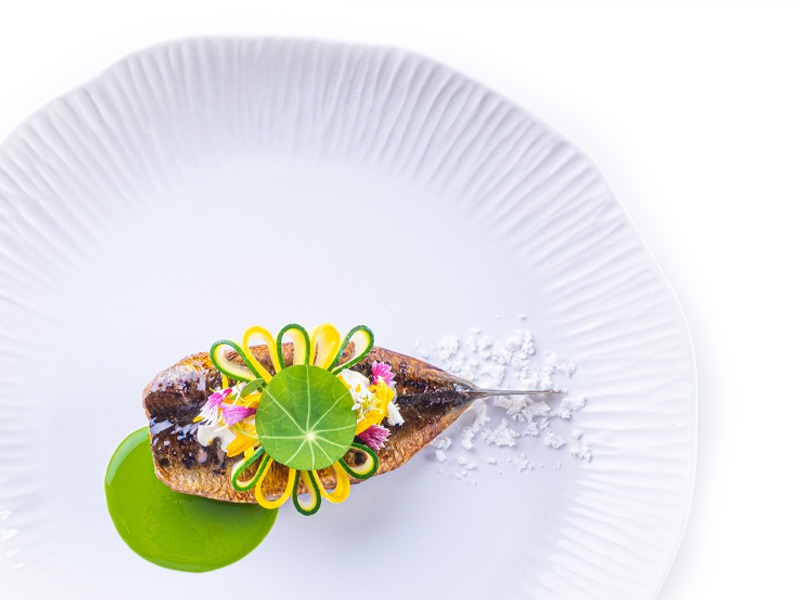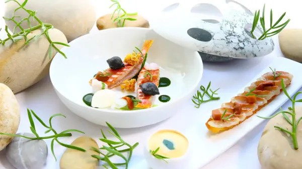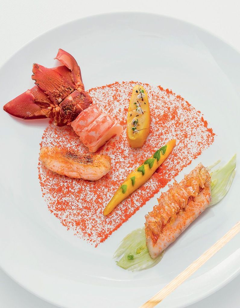 Crabe royal poché, moules, cendres et poireaux – Homard danois, algues marines et des racines de légumes – Turbotet cresson d’eau – Bœuf musqué, pousses de betteraves, pommes et moelle fumée – Noix de Saint-Jacques fraîche, crevettes et crème » sweet » – Salade d’oursin et de potiron – Foie de lingue rôti – Langue de morue » schnitzel » – Etoile de mer à la cardamome – Baies d’automne sauvages et séchées – Peau de morue cuite au chocolat blanc.