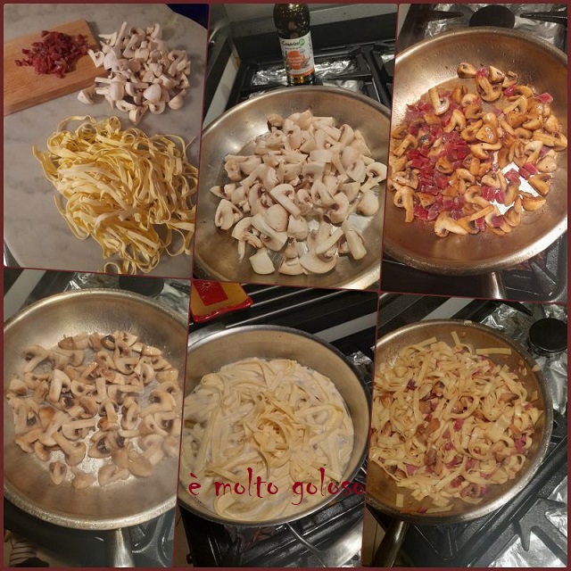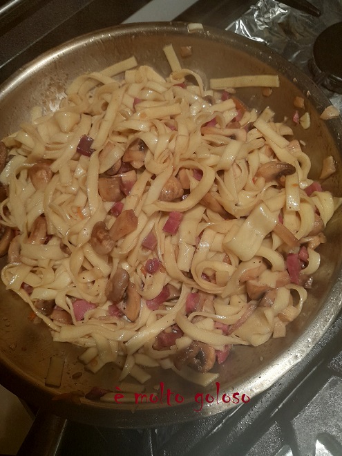 - Égoutter les tagliatelle et les ajouter à la garniture avec un peu d’eau de cuisson. Faire sauter, bien mélanger.