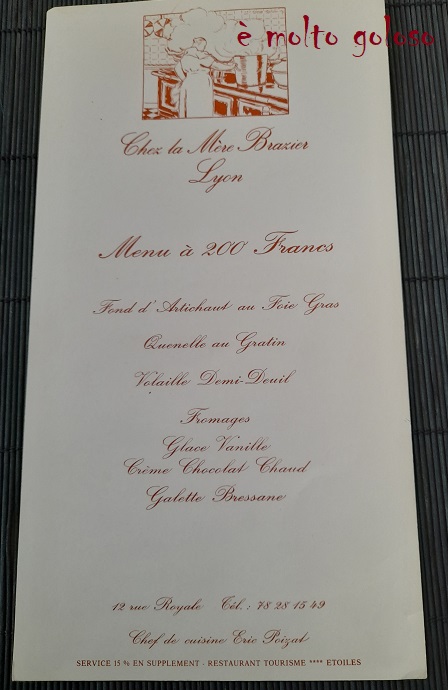 Menu à 200 francs, restaurant La Mère Brazier à Lyon, 12 rue Royale (chef Eric Poizat).