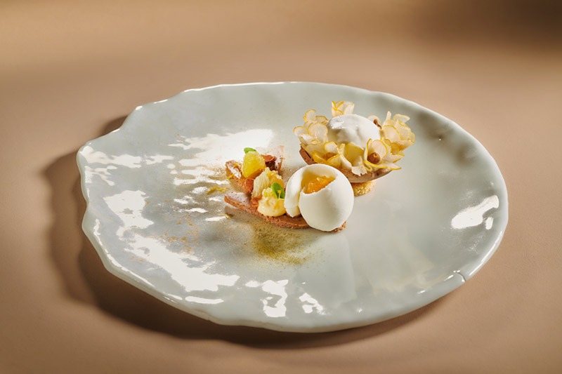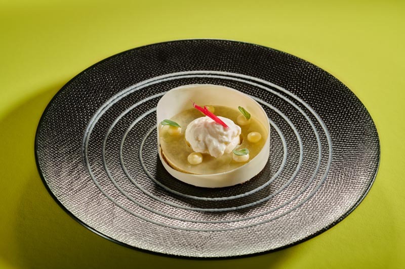 Mon Bouddh’agrume : sablé reconstitué à l’olive, amandes et agrumes, crémeux huile d’olive, praliné amandes, gel moringa, sablé olive noire, insert citron, mousse faisselle lait ribot, crème glacée faisselle lait ribot, condiment Main de Bouddha.