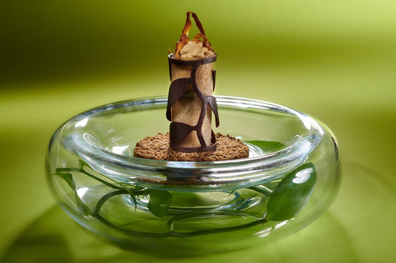Mes Racines : Glace vanille givrée et sirop la cuite, fumée à la fibre de coco, chou palmiste rouge confit au sirop la cuite, gel tamarin, crème arrow-root vanille fraîche, espuma melasse, sablé muscovado fleur de sel de St Leu, pamiste séché, tuiles cacao, opaline.