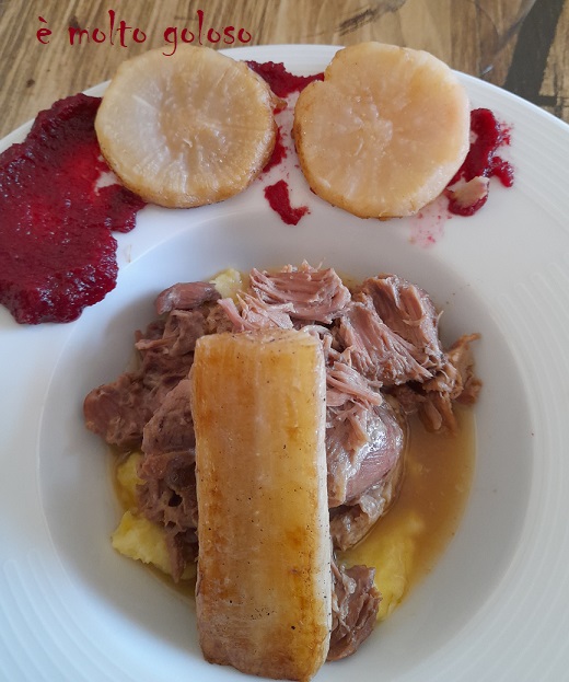 Joues de porc confites à la bière, écrasé de pommes de terre et navets